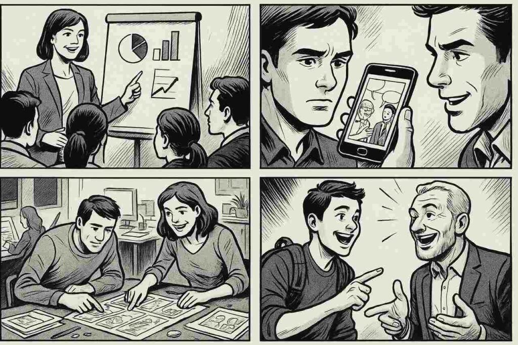 - Uniwersalność – język obrazu przekracza bariery językowe i kulturowe, dlatego komiks sprawdza się także w komunikacji międzynarodowej.