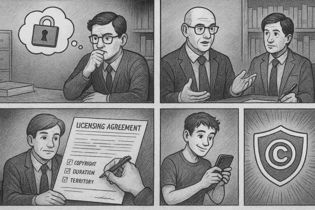 Przykład 2: „Valhalla” – Peter Madsen (Dania, 1979–2009). Popularna seria o mitologii nordyckiej była publikowana, tłumaczona i adaptowana do filmu. Każde rozszerzenie wymagało odrębnej umowy, bo prawa pozostawały w rękach autora. Ten model chronił zarówno interesy twórcy, jak i instytucji, które mogły wykorzystywać materiał tylko w jasno określonym zakresie.
