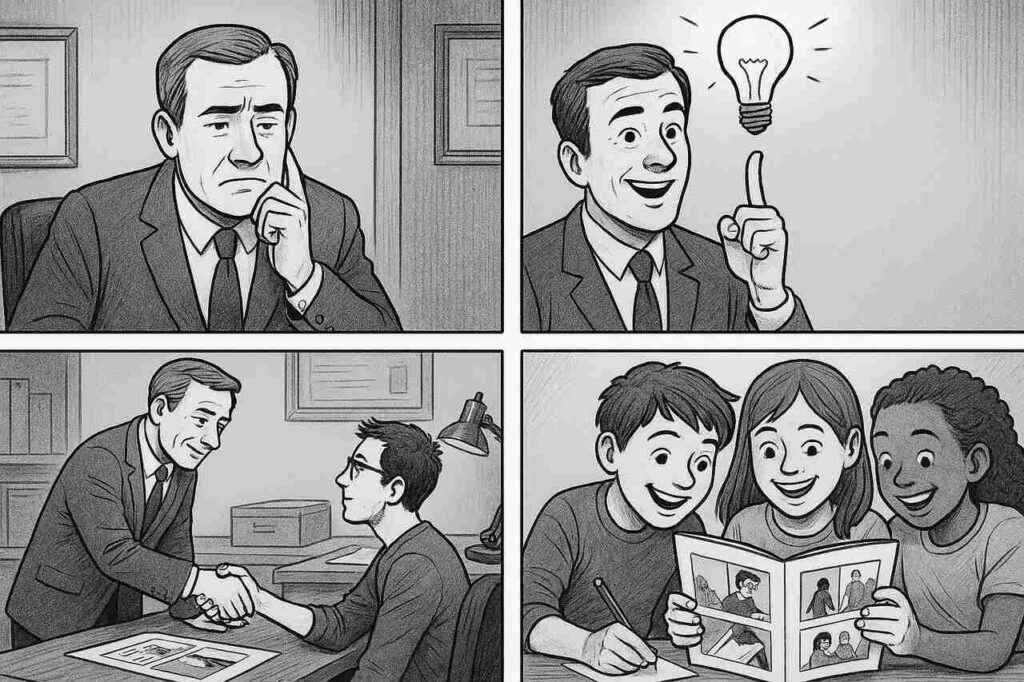 Komiks na zamówienie dobrze zaprojektowany ma szansę stać się znakiem rozpoznawczym instytucji – czymś, co wyróżnia ją na tle innych. To inwestycja w markę, która przynosi efekty zarówno tu i teraz, jak i w długiej perspektywie.