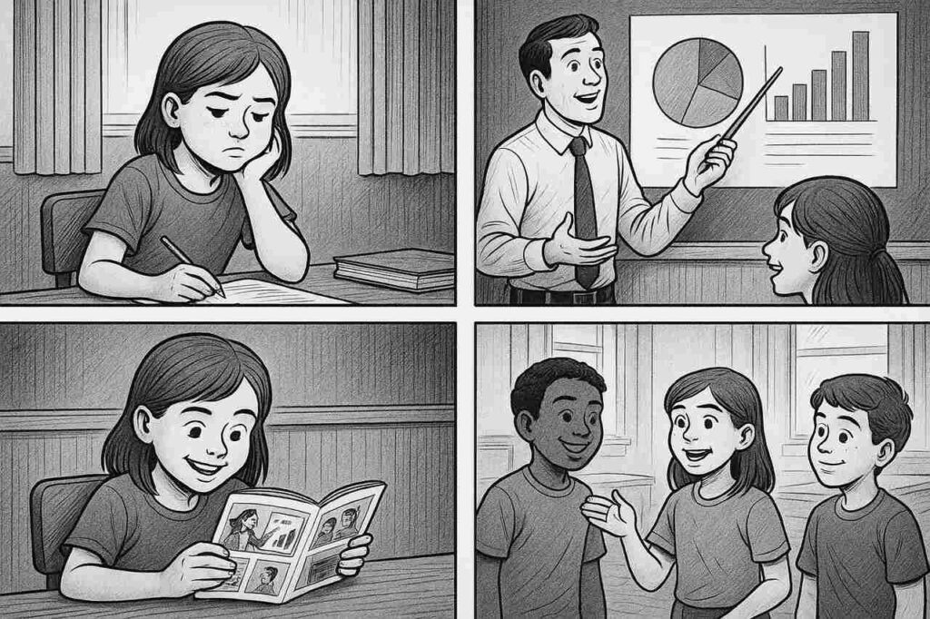 Przykład 3: „Ubongo Kids” / „Akili and Me” (Tanzania, od 2015 – Ubongo Learning). Organizacja Ubongo Learning przygotowała serię edukacyjnych animacji i komiksów, które szybko stały się popularne w Afryce Wschodniej. Projekt miał na celu wspieranie nauki matematyki, języka i umiejętności społecznych u dzieci. Skuteczność mierzono kilkoma metodami: liczbą odbiorców (miliony rodzin w Tanzanii i sąsiednich krajach), badaniami ankietowymi oraz testami wiedzy. Wyniki były jednoznaczne – dzieci korzystające z materiałów osiągały o 24% lepsze wyniki z matematyki i o 13% z języka angielskiego w porównaniu z grupą kontrolną (Learning at Scale Report, 2020). Dodatkowo rodziny deklarowały, że dzieci częściej rozmawiały o nauce i chętniej powtarzały materiał w domu. Ten przypadek dowodzi, że skuteczność narracji obrazkowej można mierzyć zarówno liczbowo, jak i poprzez zmianę zachowań.